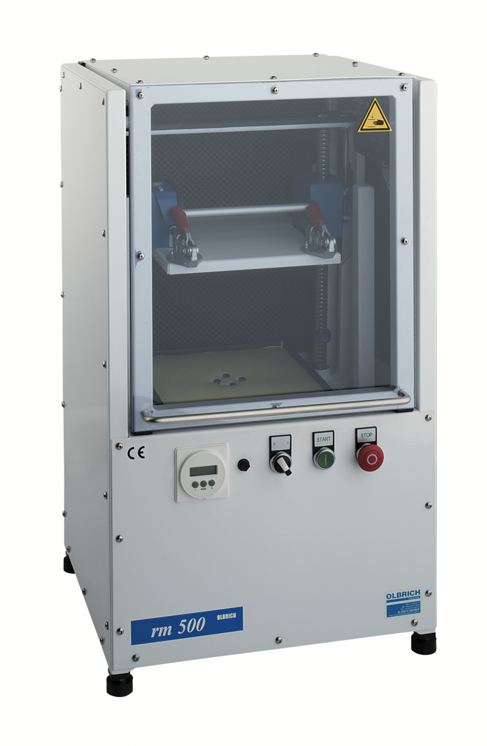 Modernste Technik, hohe Sicherheitsansprüche,ergonomische Arbeitsweise und kürzeste Mischzeiten -(auch bei kritischen, thixotropen Medien I z.B. Druckfarbe) -standen Pate bei der Entwicklung des Modells rm 500. Der Arbeitsraum ist ergonomisch angeordnet und wird über eine mit Gasdruckfeder betätigte Schwenktür beschickt. Moderne Elektronik sowie Sicherheitsschalter,Zeitschalter *) und NOT – Aus erfüllen internationale Sicherheitsstandards.Die Probeneinspannung erfolgt über eine bedienerfreundliche, stufenlos einstellbare Spanneinrichtung mit Zweihandbedienung und Sicherheit Höhenstop. In kürzester Zeit können Gebinde von 5 Liter bis zu 50 ml. sicher eingespannt werden.Der sog. Nullhub Excenter mit ca.1500 UPM und einer Axialbewegung von ca.30 mm bewegt,das Mischgebinde in nahezu allen Freiheitgraden.